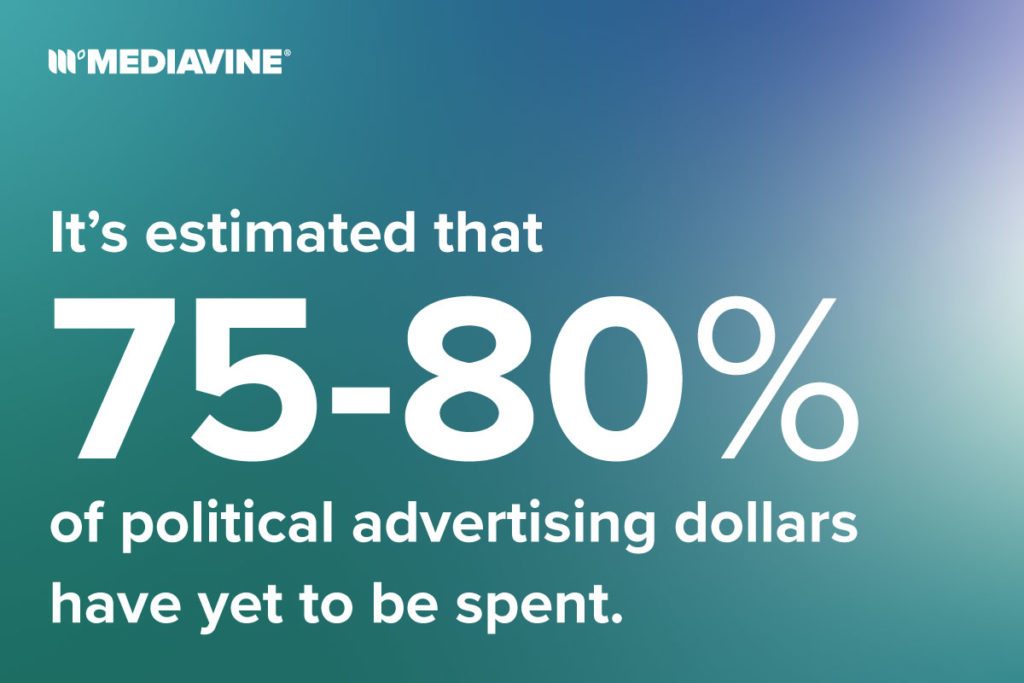 The buzz among large political buyers is that it’s estimated that 75-80% of political advertising dollars have yet to be spent, with the vast majority of spending likely to happen between the beginning of September and election day.