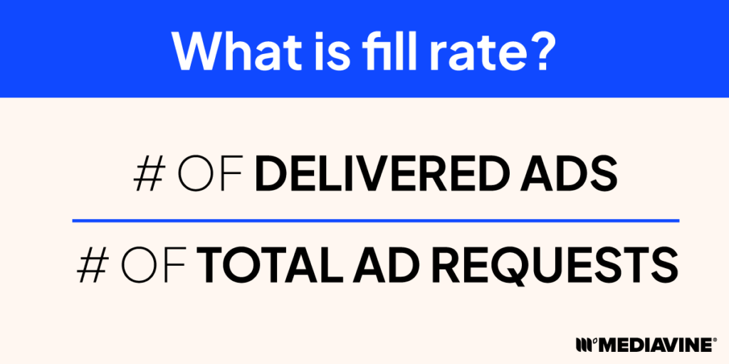 Fill rate is the number of delivered ads divided by the number of total ad requests. For example, if 100 ads were requested on a page in a day and only 90 were filled, that would mean the fill rate for that day was 90%.