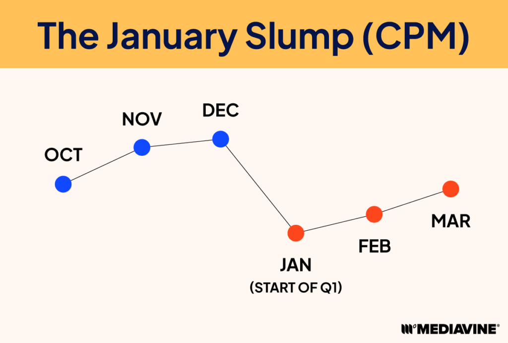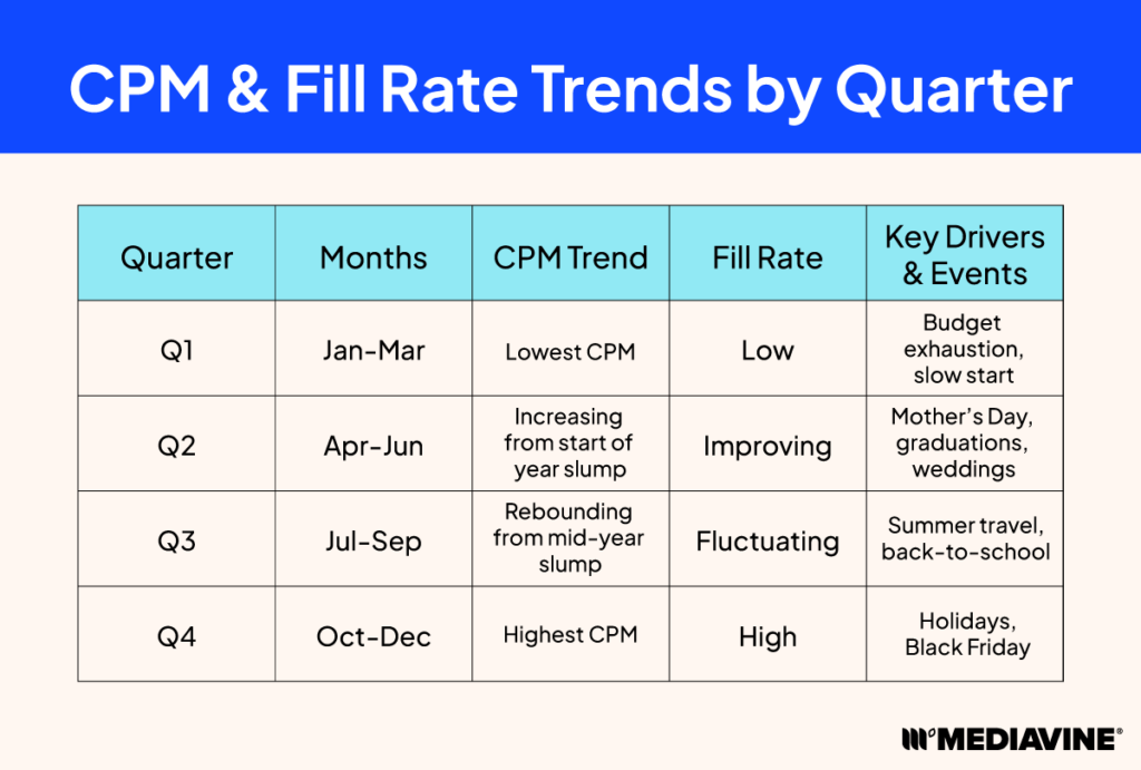 January typically sees the lowest CPM and fill rates. Advertisers have exhausted Q4 budgets, and spending slows dramatically in the new year.
