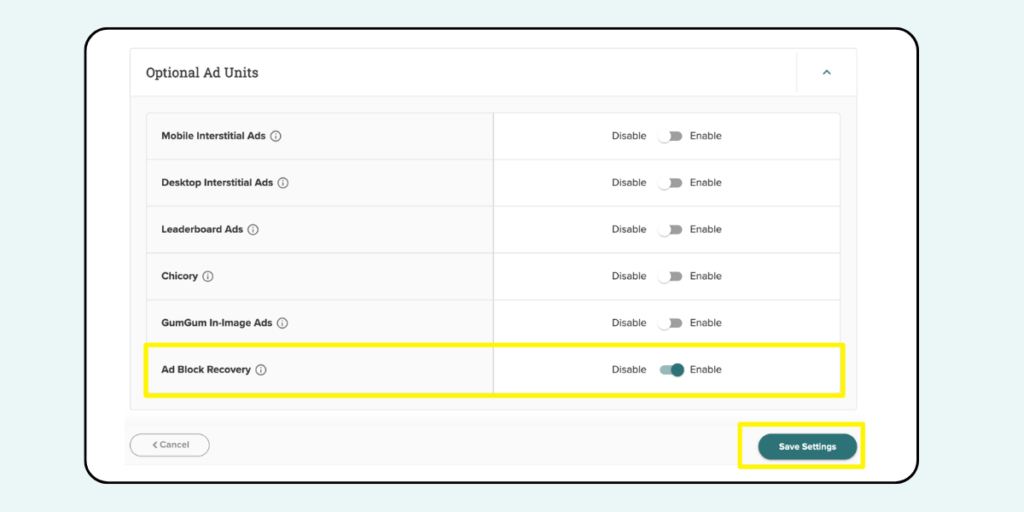 Turning on Ad Block Recovery is as simple as flipping a toggle in your Mediavine Dashboard and clicking Save.