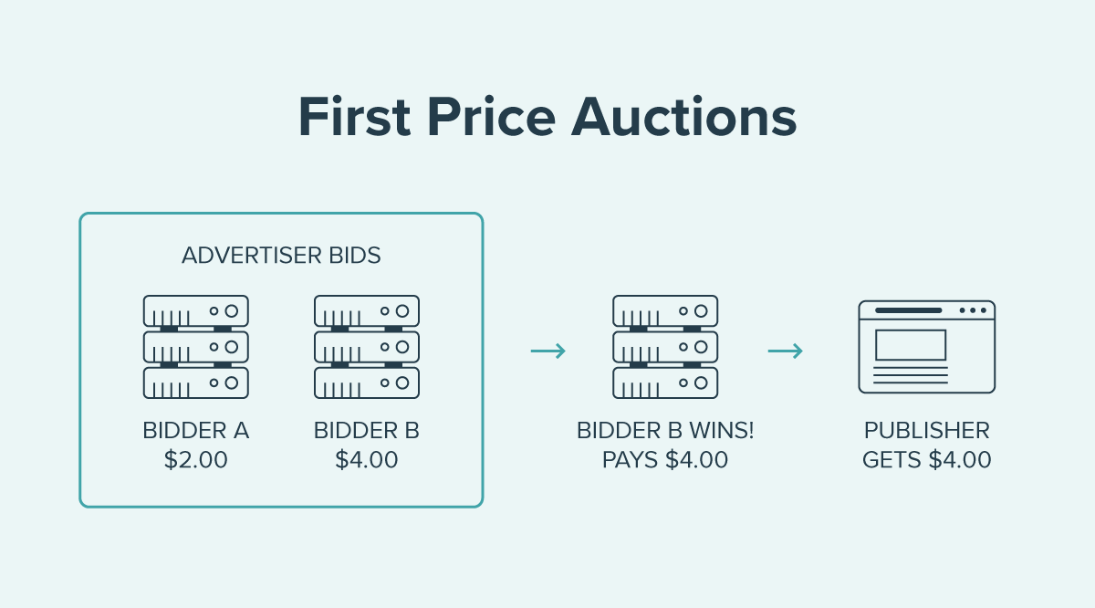 First-Price Auction – One of the two most popular auction types used in the industry. First-price means an advertiser’s Bid CPM is what they will pay if they win and serve the impression.