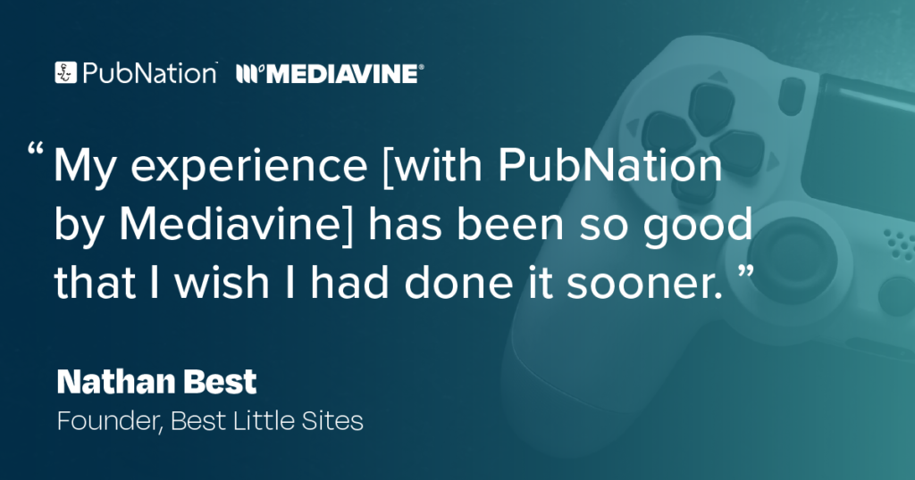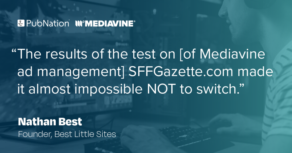 “The results of the test on SFFGazette.com made it almost impossible NOT to switch. There were several other companies that were promising big things, but Mediavine had already shown what they could do. … My experience [with PubNation by Mediavine] has been so good that I wish I had done it sooner. I likely lost out on multiple 6 figures, if not 7, by staying with my previous advertiser for almost three years longer than I should have.” – Nathan Best, Founder, Best Little Sites.