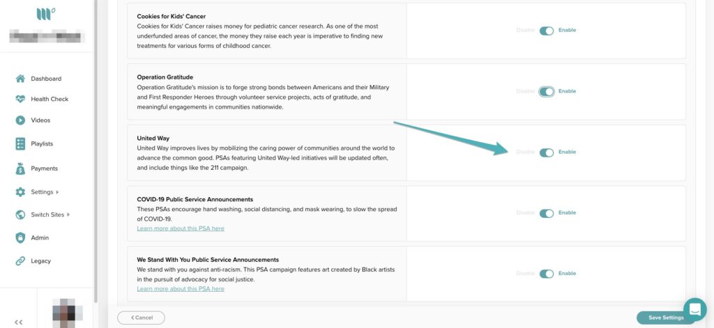 Turn on PSAs in the Mediavine Dashboard under Settings > Ad Settings > PSA Options.